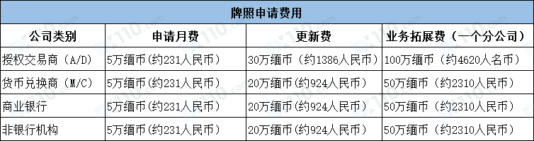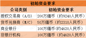 申请非银行金融机构牌照的初始资金要求是100万缅币(约4620人民币),申请月费为5万缅币(约231人民币)。